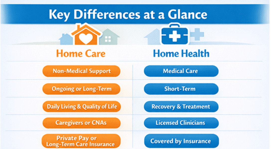 Home Health Care is skilled medical care ordered by a physician, including nursing services, physical therapy, occupational therapy, or speech therapy. Services are delivered by nurses, therapists, or licensed professionals. The goal is recovery or rehabilitation—there’s a defined endpoint. Medicare often covers home health when medically necessary and patient is homebound. A physician order is required, and there’s formal clinical oversight.